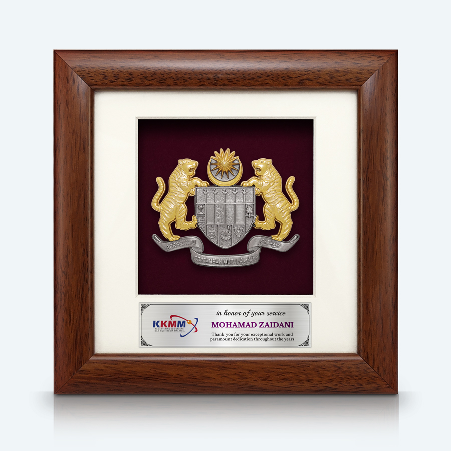 7″ X 7″ Frame With Gold Plated Pewter : Coat Of Arms Of Malaysia (Jata Negara Logo Malaysia)